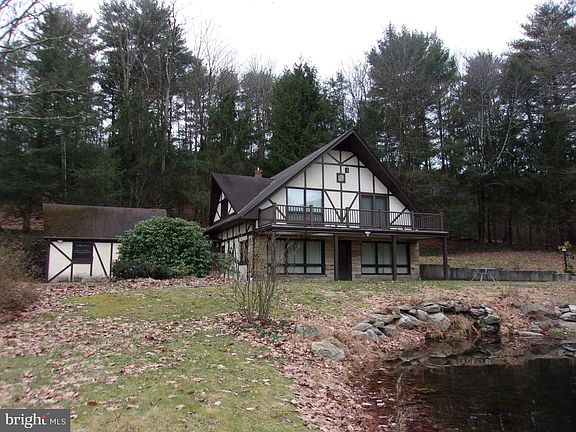 Ideal property for all year living, Hunting lodge, Vacation home, Retreat, Seclusion and Entertainment. Two spring fed ponds for fishing or swimming. Great area for hunting. Well maintained with full bath on each level. Attic is walk up with floor. Fireplace has a pellet insert. There is a gas stove in the dining room. Patio off main level, balcony with great view of amenities from main bedroom. Attached garage has a loft for storage. Detached garage has a second level for storage or general utility. Privacy galore.