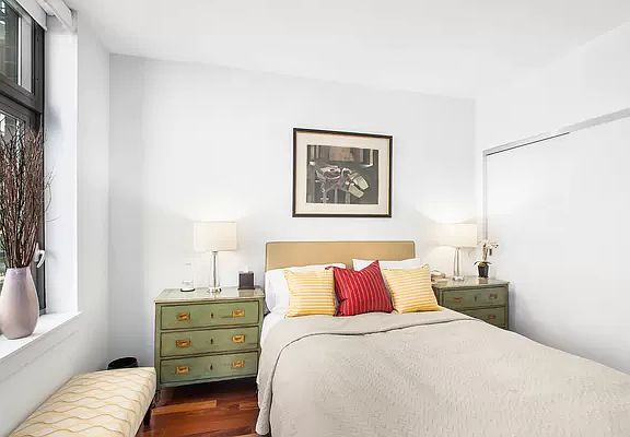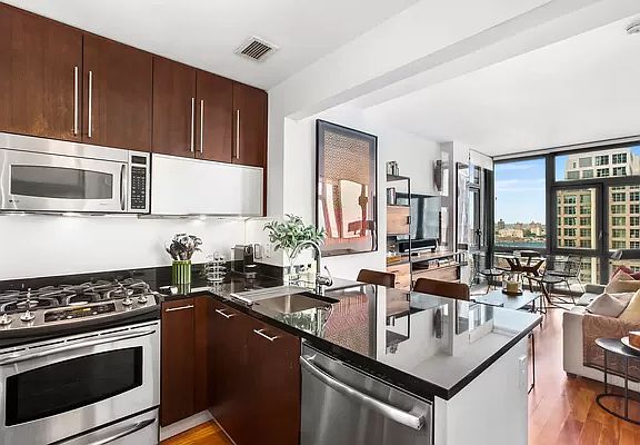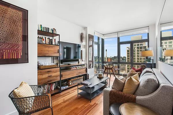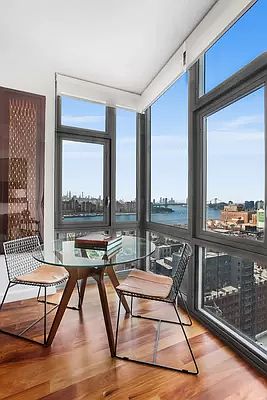 Welcome to Apartment 21D at 100 Jay Street! Perched on a high floor within the D-line of an exceptional condo, you get the highest floor-to-ceiling windows in this line giving you sublime light and stunning views of the Manhattan Skyline and East River. The interior apartment has plank Walnut flooring throughout. The open kitchen features stainless steel appliances, a breakfast bar, and ample cabinet storage. Having been legally converted to a one bedroom apartment, this apartment's interior space, views, sunlight, finishes and location offer one of the best priced one bedroom apartments in DUMBO. Additionally, the apartment has an in-unit washer/dryer and central air conditioning. Located one block from the York Street subway station, 100 Jay Street Condominium has a full-time doorman, gym, playroom, bike room, live-in super, and in-building access to a third party garage. Don't miss out on this DUMBO gem!