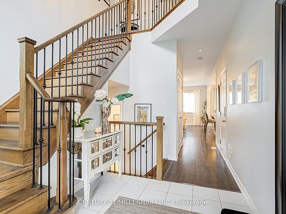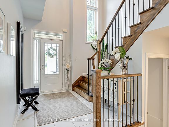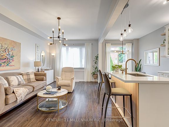 Outstanding, freehold townhome with much attention paid to detail featuring a grand vaulted two storey foyer and 9 foot main level ceiling. Upgraded dark stained wood staircase with wrought iron pickets, brass chandelier. Featuring an open, modern design Living/dining and eat in chefs dream kitchen combination with espresso finished plank size laminate flooring throughout. Fluted wood wall feature with built-in floating white storage unit and modern chandelier. Upgraded kitchen with shaker style cabinetry including lit glass display cabinetry, crown molding, matted gold hardware, centre island with fluted wood panel, breakfast bar, quartz counters/quartz backsplash under valance lighting, extra large undermount sink, all stainless steel appliances, including a sleek design exhaust fan, walk out sliding door to patio. Three large bedrooms all seamlessly tied in espresso finish laminate flooring. Huge primary with a large walk-in closet/organizers, modern three piece ensuite with huge tempered glass separate shower Stall/rain shower head and handheld, matching quartz counter/undermount vanity sink. Upgraded main four piece bath with sliding glass doors/rain showerhead/handheld. Professionally finished lower level family room open concept kitchenette with open shelving, laundry room perfectly organized with backsplash feature, laundry tub, and shelving, pot lighting throughout, cold room, pantry, storage underneath staircase. Central vacuum, garage opener, interior garage access. Prime neighbourhood close to schools, parks, public transit, stores, spas, places of worship and recreation centers. Private fenced in yard with stone patio and flowerbeds. Attached on one side only by the garage allowing direct access to the backyard. This is a truly one of a kind opportunity to buy a completely upgraded, ready to move in condition home with a modern flare for luxury and functionality! Shows 10+++