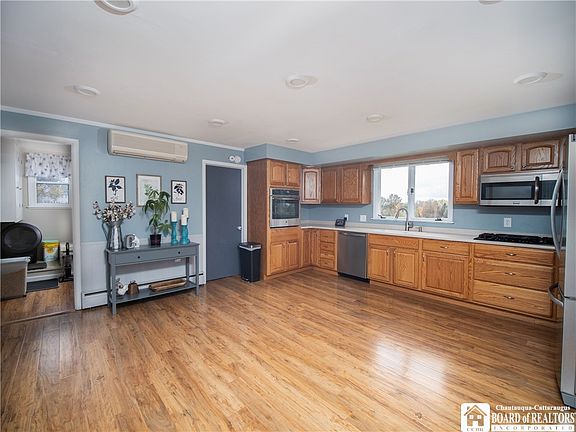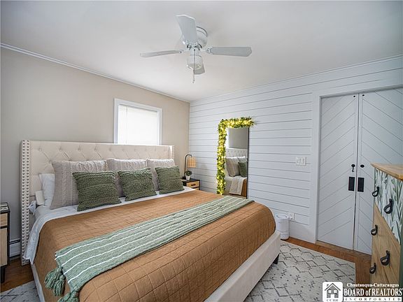 OPEN HOUSE SATURDAY 12/2/23 11AM -3PM. A taste of country living just inside the village! This charming, beautiful, and meticulously cared for modern farm home is situated on just shy of an acre of land ln the village of Fredonia. With a fully fenced-in back yard and a large multi-level pole barn, there is no shortage of useful space on this property! The well lit and spacious country style kitchen overlooking the vineyards consists of Corian countertops, kraftmaid cabinets, stainless steel appliances, and plenty of reccessed lighting Just off of the kitchen is a walk-in pantry and a first-floor luandry room with a utility sink. Hardwood floors, custom-made sliding barn doors, reccessed lighting, and central AC highlight and beautifully accent the 1st floor's primary living areas in the formal dining room, primary bedroom, and the living room. The upstairs is equipped with 4 more good-sized bedrooms and a 2nd full bath with updated double vanity sinks and fixtures. All appliances, including the washer and dryer, are included in the sale. Located a stone throw away from Fredonia Central Schools and within minutes of downtown Fredonia. This move in ready home is truly a must-see!