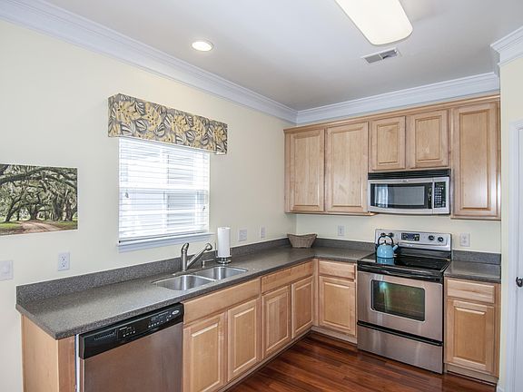 Great entry price point for Charleston/Summerville area! This 2 BR, 2.5 BA end unit townhome includes a one-care garage. Featuring hardwoods downstairs and a light-filled kitchen with ample countertop space and a corner pantry. Family room is spacious. Ceiling fans and fixtures have been updated. Both bedrooms are upstairs and each has an en suite bathroom complete with dual sink vanity, garden tub, and separate shower. HVAC new in 2013. Located across from Carnes Crossroads. Easy to show! See agent notes for Closing Cost contribution opportunity!
