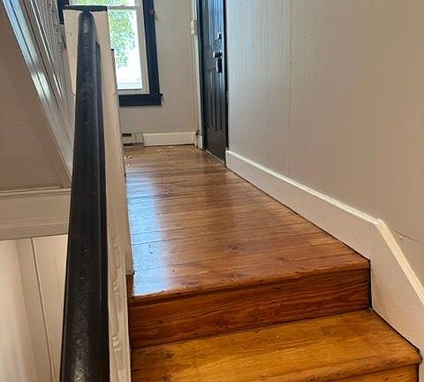 Freshly painted one bedroom/1 bath fully remodeled apartment located on the second floor of a large stately house with 5 apartments. Located conveniently and within walking distance of downtown Westminster near pubs, restaurants, yoga, library and shops. This beautifully remodeled building has refinished hardwood floors on the stairway upon entering the building, This is a shared hallway with a shared sunroom on the ground level when entering the building. This apartment has a living room/kitchen combination with new bright white cabinets with black hardware that really stand out and give it a modern feel. The counters are an upgraded modern gray laminate. Includes new bright white range refrigerator and microwave. Freshly painted a nice, neutral gray with bright white trim and six-panel doors. There is a storage closet off kitchen with French doors. The living room/kitchen and bedroom both have lighted ceiling fans. The bedroom is a nice size with another double closet with French doors. The bedroom and living room both have mini-split units that provide heat and central air conditioning. The spacious bathroom is also fully remodeled with shelving for linens and has a new full size tub/shower combination, toilet, vanity and upgraded lighting. The living room, kitchen and bedroom have new luxury vinyl plank flooring and the bathroom has new linoleum flooring. New recess lighting in living room, kitchen and bedroom. One coin-operated washer and dryer in entry in front of the building. $1,150.00 per month $1,150.00 security deposit 18-month lease is required. Application fee is required. Owner pays for water, sewer and trash services. Tenant is responsible for electric only (BGE). Coin-operated laundry in the building. Off street parking is available. NO SMOKING PLEASE! Owner may allow one cat with additional pet deposit and monthly fee. No dogs please.