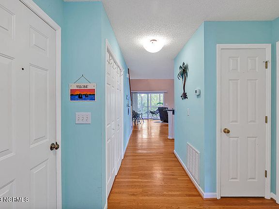 This 3 bedroom 2 full bath end unit townhome in the Carolina Beach Village community boasts a lengthy list of features that should check all your boxes. You'll enjoy vaulted ceilings and an open floor plan with well placed windows that let in tons of natural light. There are hardwood (full thickness oak) floors throughout and a gas log fireplace in the living area. The kitchen offers eat-at-bar, plenty of other counterspace, and Bosch dishwasher and disposal both replaced in 2019. Additional features include a whole house water filtration (activated charcoal) system, slider glass and all windows replaced in 2022 (all with tempered glass), roof replaced in 2021, 40 gallon water heater with dual heating elements replaced in 2019, and HVAC unit replaced in 2017 (with coil replaced in 2019). The private, 8' X 14' screened in back porch overlooks a serene, wooded, natural space, perfect for morning coffee and evenings after a day at the beach. The first floor bedroom has direct access to one of the full baths. Upstairs, there are two additional bedrooms, one with direct access to the other full bath. One bedroom/loft overlooks the living space; it is currently used as a home office and is an excellent space for remote work or might be used as a media room. This home features an attached, enclosed one car garage plus extra storage closet off the screened porch. HOA covers master insurance and common area maintenance. Carolina Beach Village is located just across the Intracoastal Waterway on Pleasure Island on a quiet, tree lined street with easy access by bike or golf cart to local beaches, the Wildlife Boat Ramp on the Intracoastal Waterway, the Carolina Beach boardwalk, restaurants, and shopping. Residents have the option to purchase an annual pass for free parking at Town beaches and other locations.