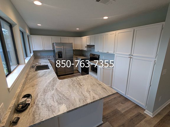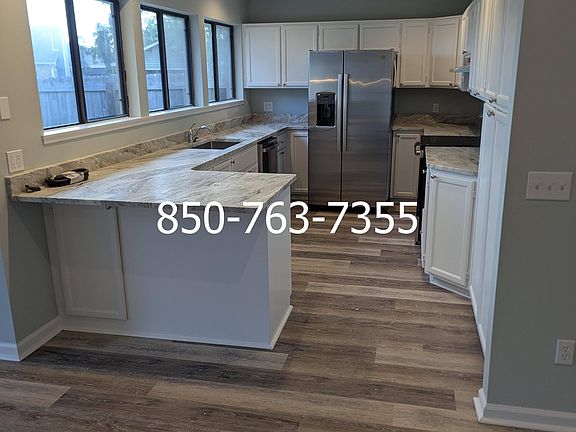 Welcome to 100 Limestone Lane, Panama City, FL 32405. This well-designed three-bedroom, two-bath home offers 1,700 square feet of bright, open living space with modern finishes and plenty of room to relax or entertain. The kitchen is a true highlight, with abundant cabinet storage and expansive granite counter space that make cooking and entertaining a breeze. All of the Whirlpool appliances are brand new in stainless steel finish. The living areas are finished with beautiful luxury vinyl plank flooring, all new interior paint, and updated lighting that add both style and comfort. High ceilings make the great room feel huge, big patio doors let in tons of natural light, and there is abundant built-in cabinetry for mounting a TV, hifi equipment, book storage, and the like. The huge master suite features a patio door leading to the back patio, a walk-in closet, double vanities in the bath, and a jacuzzi tub with a separate shower and water closet. Step outside to a fully privacy-fenced backyard with a double side-gate entrance perfect for storing a boat or trailer. A double car garage gives you plenty of storage, and there is a shallow well for inexpensive irrigation. The home sits in a quiet residential neighborhood with sidewalks and underground utilities, creating a clean and welcoming environment. The location is absolutely unbeatable.. Just off the 23rd Street corridor near Home Depot, you'll enjoy quick access to shopping, restaurants, schools, and medical facilities. Downtown Panama City, the beach, and Tyndall AFB are only a short drive away, making this one of the most convenient spots in town. Long term residents are preferred. Small, non aggressive pets are welcome at $22.50 per month per pet. Sorry, we do not accept Section 8.