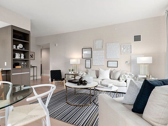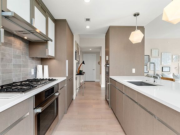 Step into this beautifully appointed 1250+ SF corner unit, where sunlight pours in from every direction, creating a warm and inviting atmosphere throughout the day. Expansive windows frame stunning city views, while custom electronic blinds offer the perfect balance of privacy and light control. The spacious floor plan is designed for both comfort and style, featuring a large island in the kitchen—ideal for entertaining and conversation. Whether hosting friends or enjoying casual meals, this central feature adds both functionality and elegance to the space.The kitchen is outfitted with modern finishes, including sleek cabinetry and plenty of counter space. Custom wallpaper adds a unique touch to the living spaces, enhancing the home’s contemporary feel. Both bedrooms offer ample closet space and natural light, with the master suite providing a serene retreat.