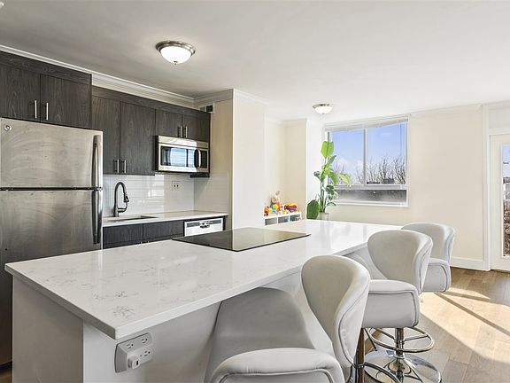 If you're looking for open living space, private terrace and NYC views, this beautifully renovated 2 bedroom, corner residence is the perfect starter home and is being offered at the perfect price. This South facing residence offers light from sunrise to sunset, wide plank floors, modern design and is a storage lovers dream. The open kitchen is equipped with polished quartz counter tops, breakfast bar, modern cabinetry, and stainless steel appliances. Enjoy the large Master bedroom offering an en-suite bathroom with walk in shower, modern vanity and sliding glass doors. The second bedroom is located directly across from the guest bath and offers a full bath, sleek tile and modern fixtures. Combined with brilliant views, this full-service building includes terrific amenities and a coveted location, just minutes to NYC via transportation or a few blocks to Hoboken and across the street from Washington Park. Benefit from 24-hour concierge service, outdoor pool, residents lounge, gym, dry cleaner, deli and reasonably priced on-site parking. Storage available for fee. Shuttle to Hoboken PATH or NY Waterway Ferry. Maintenance Includes: Taxes, Electric, AC, Heat, Hot/Cold Water. Board Req. 10% down, 40% income to debt. Dogs allowed. In person showings allowed with safety rules in place. Check out the virtual tour.