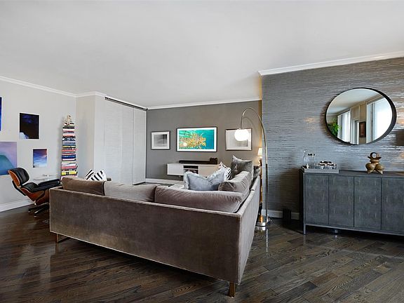 Enjoy this exceptional 2 bedroom, 2 bath residence with direct NYC and Hudson River views from your private balcony. This distinct residence offers 1140 square feet of expansive living space featuring floor-to-ceiling custom California closets, crown molding, custom blackout window treatments and diagonally laid gorgeous oak floors throughout. Modern designer touches include, Philip Jeffries 'socialite silver' textured wallpaper and Jonathan Adler entry lighting. Additionally, this unit is unique from similar units in the line by offering an added alcove area which creates an substantial living room. The open kitchen offers designer finishes, custom cabinetry, strategically cut glass mosaic backsplash by Artistic Tile, breakfast bar and sleek granite counter tops, perfect for entertaining. Kitchen is equipped with premium stainless steel appliances including refrigerator, microwave, dishwasher and electric cooktop. The generous master bedroom offers, NYC views, double sized closet and an en-suite bathroom with storage vanity, and sliding glass door walk-in shower. The second bedroom boasts NYC views, large closet and is located near the triple sized hallway closets and second bath. Combined with brilliant views, this full-service building includes terrific amenities and a coveted location, just minutes to NYC via transportation or a few blocks to Hoboken. Benefit from 24-hour concierge service, outdoor pool, residents lounge, gym, dry cleaner, deli, on-site day care center and on-site parking for $150p/m.