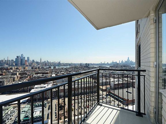 Incredible NYC and Hudson River views for miles in this wonderful 3 bedroom, 2 bath corner residence with private balcony. Enjoy 1375 square feet of expansive living space featuring beautiful light wood styled floors, a multitude of closet space, NEW sound proof insulate windows and terrific details throughout. The kitchen offers lots of cabinetry, mosaic glass tile backsplash, granite counter tops and is fully equipped with whites appliances including refrigerator, microwave, dishwasher and glass top electric range. The large primary bedroom offers incredible NYC views, and an en-suite bathroom with ceramic tiled walk-in shower, glass sliding doors and porcelain pedestal sink. Each additional sizable bedroom features sweeping city views and closets. Both rooms are located near the ceramic tiled bath / shower combination with sliding glass doors and porcelain pedestal sink. Pictures are digital. Description is correct. Listing agent must escort all showings. Combined with brilliant views, this full-service building includes terrific amenities and a coveted location, just minutes to NYC via transportation or a few blocks to Hoboken. Benefit from 24-hour concierge service. Morning shuttle to Ferry and PATH train station in Hoboken. Light Rail 1 block south (Hoboken 9th st platform). Day care on-site.