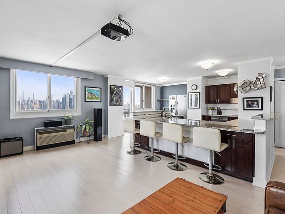 PENTHOUSE CORNER UNIT with 270 degree TRUE PRIVATE PANORAMIC SKYLINE VIEWS! Your dream condo IN THE CLOUDS!! Largest 2bed line in the building, completely renovated: redesigned kitchen with added cabinets & enormous island, new noise-reducing windows, private balcony, 100 inch projection screen & video system... In a LUXURY BUILDING fully updated inside & out: 24hr concierge & security, pool, gym, lounge, workspace, a DELI IN THE BUILDING, dry cleaners, GARAGE PARKING w/ EV CHARGERS, storage, bike storage... PET FRIENDLY with new DOG PARK... DAYCARE & PRESCHOOL right in the BUILDING!! Bus to NYC right downstairs, Lightrail a block away, morning shuttle to Path train... Tennis, basketball, playgrounds, & huge park right next door. Short walk to Shoprite & Trader Joes. Bars & restaurants everywhere... Monthly fee includes PROPERTY TAXES & ALL UTILITIES (heating, A/C, water, hot water, electric)... Nothing on the market right now compares...