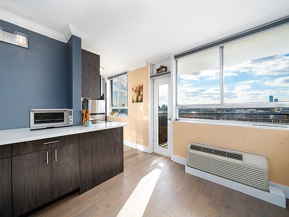 PRICE ADJUSTED AND SELLER NOW OFFERING A $2000 CREDIT TO BUYER AT CLOSING. Welcome to The Doric, a high-rise building overlooking Hoboken that boasts unobstructed views of New York City skyline. This spacious one-bedroom home features southern and easter exposure flooding it with a ton of natural light. With an attached outdoor patio and a view of the Freedom Tower, this home has plenty to offer for its next owner. The kitchen was recently renovated offering new stainless steel appliances and dark wooden cabinets that stand out against the beautiful brand new light hardwood flooring throughout the home. HOA includes EVERYTHING - heat, electricity, AC, building maintenance, management company, amenities, etc. The Doric offers a 24-hour concierge, onsite parking, mailroom with package safekeeping, seasonal outdoor pool, onsite laundry, fitness center, a work from home conference center, and shops on-premise for your convenience. Conveniently close to the Lincoln Tunnel, NJ Transit bus line 119 can bring you directly into Port Authority in minutes. Make this your home today!