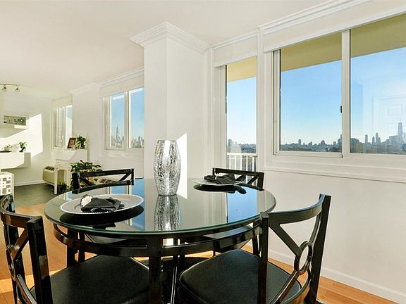 Come home to breathtaking panoramic New York City views! This premium, spacious and bright, unit has hardwood floors throughout. Additional features include granite counter tops, glass mosaic tile backsplash, crown molding, all new windows, custom closets, walk-in closet and much more! Newly refurbished terrace, ideal for grilling as you enjoy your stunning New York City views. Pool, gym and parking are available for a fee. Great location, easy commute to Manhattan, free AM shuttle available to the Path. This unit can also be converted into a two bedroom.