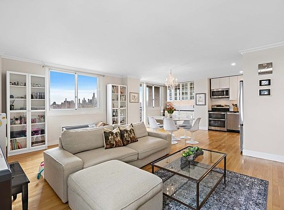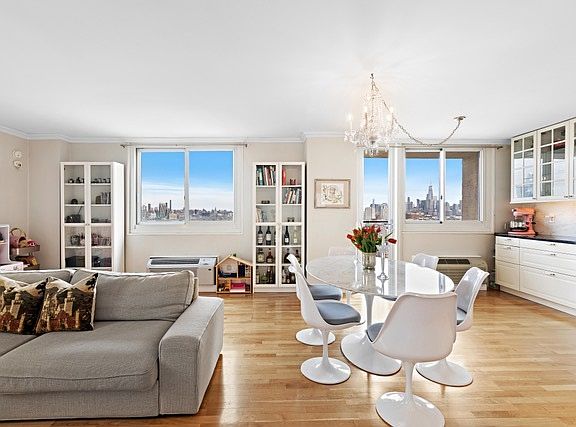 Nestled on the border of Hoboken, Jersey City, and Union City. This elegant high-rise apartment features breathtaking panoramic NYC and river views, from every room. An architects touch has renovated this 3bed/2bath coop to provide amazing living and storage space with no detail left undone. Featuring an open gourmet kitchen/living room with s/s appliances, and granite countertops. Hardwood floors, tiling, custom closets, and new windows contribute to this luxurious residence. The Doric is a full-service building with 24-hour concierge service, a pool, gym, cleaners, a gourmet deli, and Residents Lounge. Commuters dream...located close to the following NYC buses #123, #126, and # 119 Express which is only two stops away from Port Authority. Easy access to the Light Rail Station, and the Hoboken Path Station. A Free AM shuttle is provided to the Hoboken Path. The monthly maintenance includes all utilities and taxes.