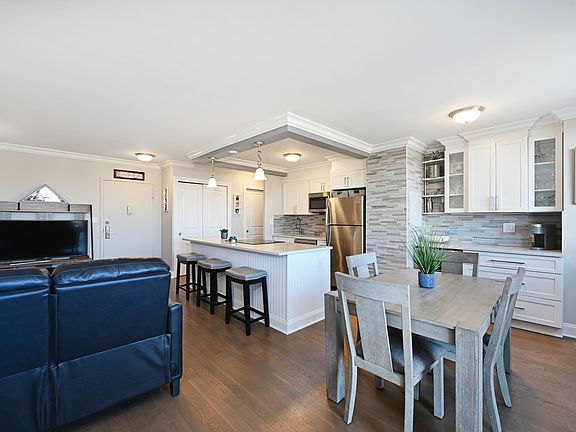 Kitchen features shaker cabinetry, mosaic ceramic backsplash, sleek quartz counter tops and polished hardware. Kitchen is fully equipped with stainless steel appliances including refrigerator, dishwasher, microwave drawer and glass top electric range.
