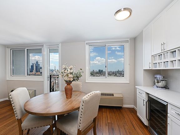 SHOWINGS START FRIDAY 3/15 after 3PM. Enjoy breathtaking views of NYC and Hudson River from every window of this modern renovated 2 bedroom, 2 bath, with private balcony and towering over Hoboken. This open layout offers wide plank oak styled flooring, NEW insulated noise reduction windows and modern lighting throughout. Host friends and family in the open concept chefs kitchen featuring shaker cabinetry, long lengths of quartz counter tops, subway tile backsplash, stainless steel appliances including microwave, refrigerator, dishwasher, wine cooler and electric range. Relax in the generous primary bedroom while you enjoy direct NYC views, and convenient en-suite bathroom featuring a subway tile surround, walk-in shower with frameless glass door, storage vanity and modern lighting. The second bedroom features spectacular views, closet and is located near the double sized hallway storage closets and the modern ceramic tiled second bath with soaking tub, storage vanity and stylish lighting. Combined with brilliant views, this full-service building includes terrific amenities and a coveted location, just minutes to NYC via transportation or 1 block south to Hoboken and the Light Rail 9th St platform. Benefit from 24-hour concierge service, outdoor POOL, residents LOUNGE, GYM, DRY CLEANER , DELI, ON-SITE DAY CARE center and on-site parking for $150p/m. FREE MORNING SHUTTLE to PATH train station. 119 Bus to Port Authority directly in front of building. Maintenance includes taxes, electric, heat, AC, hot/cold water. Seller may request a 60-75 day close (extended).