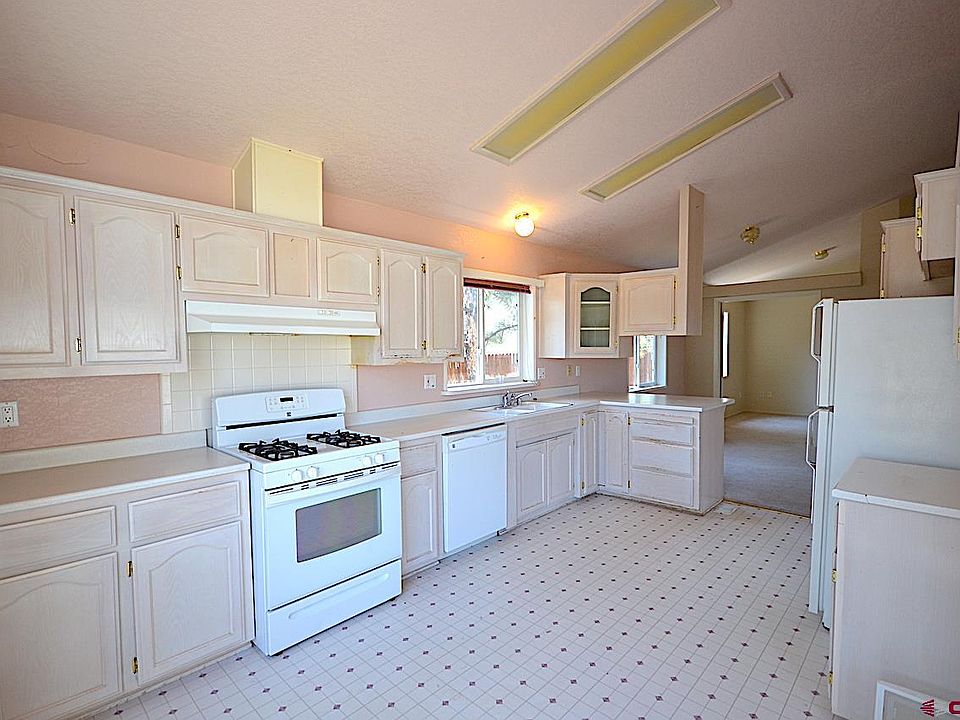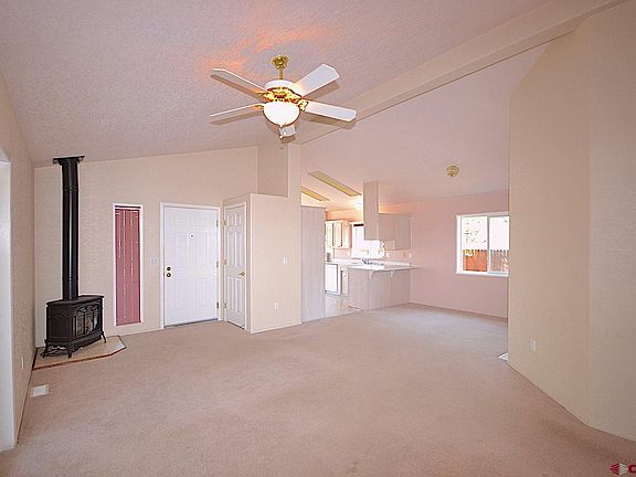 Wonderful opportunity to own what is currently the lowest price home within La Plata county that is irrigated and on a permanent foundation with a 2 car garage. The lot is a larger corner with a full in ground sprinkler system and no neighbors to the North. This home offers just over 1300 that consists of 3 large bedrooms with copious amounts of storage space and 1 ¾ baths on an amazing corner lot with a detached 2 car garage. The home is an open concept floor plan with a large eat in kitchen and tons of cabinet space. The open concept family room offers a corner wood stove, access to the covered patio and 2 car detached garage. The third bedroom is located off the dining area and could be used as an office or as a bedroom as it offers 2 large closets. Down the hall, there is the laundry room which gives you easy access to the back yard which is fully irrigated with an in ground Rain Bird system. The yard is fully fenced for privacy. Back inside the home you will find a ¾ bath in the hall to service the 2 bedrooms which both have more than ample storage. The master bedroom is light and bright and offers a huge master bathroom with a large vanity, shower/tub combo and tons of cabinet space. The home does offer central air conditioning as well. Just minutes from the casino and the Patio Restaurant which arguably offers the best pies in La Plata County. This home has so much to offer at such a reasonable price.