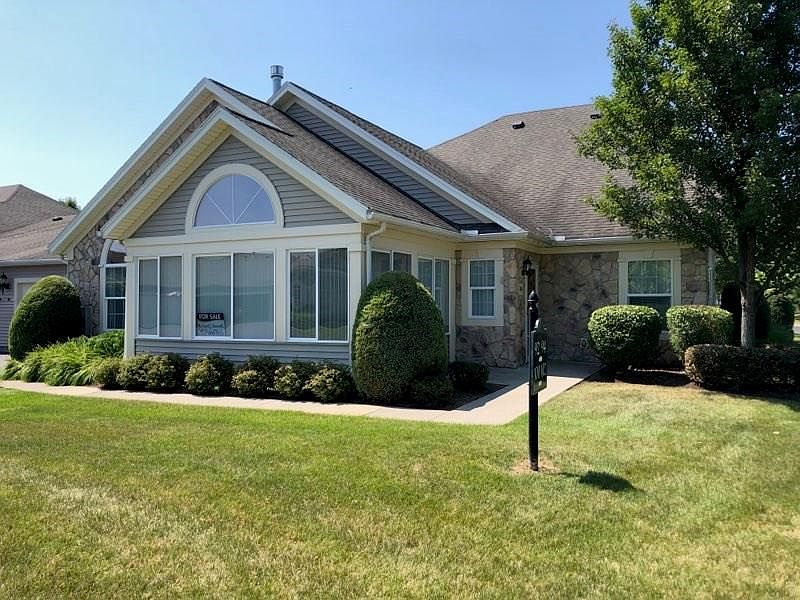 Spectacular 2 bedroom Abby design Ranch end unit town home in the Villa's Of Fieldstone. Sprawling fully applianced kitchen with snack bar, formal dining room, great room with gas fireplace, cathedral ceilings, 4 season room, 1st floor laundry, 2 car garage, must check out the club house, pool and fitness center! (No screens for windows)