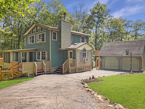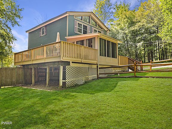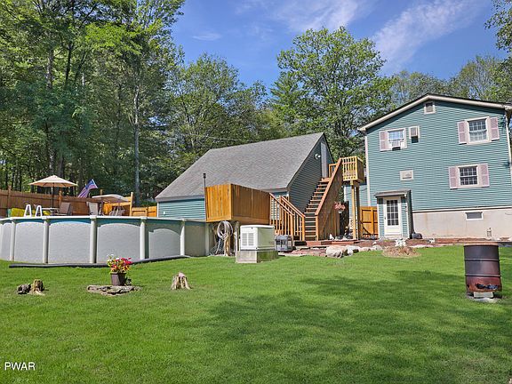 STUNNING 4-BEDROOM, 2 BATHROOM HOME NESTLED ON A PRIVATE 1.1 ACRE CORNER LOT COMPLETE WITH SPLIT RAIL FENCING AND AN INVITING ABOVE-GROUND POOL! The expansive deck and three finished floors of living space provide ample room for relaxation and entertainment. Located just minutes from I-84, this home offers easy commuting to NY and NJ, while boasting low property taxes. The open floor plan features a modern kitchen with a large island, stainless steel appliances, a beamed ceiling, knotty pine walls, and laminate floors. The spacious dining area, with its garden window, is perfect for hosting holiday gatherings. The 3-season room on the main level adds even more living space to enjoy year-round. Two large bedrooms and a full bathroom complete the main floor. Upstairs, you'll find a stunning family room with a wood-burning stone-faced fireplace, high ceilings, exposed beams, knotty pine walls, and charming floors. The primary suite offers a walk-in closet and a luxurious jetted tub, making it the perfect retreat. The finished lower level is an ideal hangout space, featuring brick and wood accents that exude warmth. This versatile area can serve as a guest suite, recreation room, home office, gym, and more. The lower level also includes laundry facilities. Two car garage with tons of storage space above! A whole-house generator ensures peace of mind. Enjoy being just minutes away from historic Port Jervis and Milford, two vibrant destinations offering fabulous dining, breweries, shopping, live music, theater, and more! This home in the Delaware Valley School District is the perfect blend of comfort, convenience, and charm.