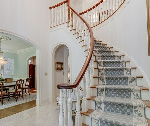 Enter through a grand two story foyer featuring a curved staircase with intricate craftsman details and twin glass display cases flanking the front door. A formal dining room is located to your left with custom plaster molding and wainscoting which opens into both the foyer, as well as the main living area. To the right is a handsome study with a gas log fireplace which provides secondary access to the owner's suite via double doors. This space could serve as a second sitting room or a home office.