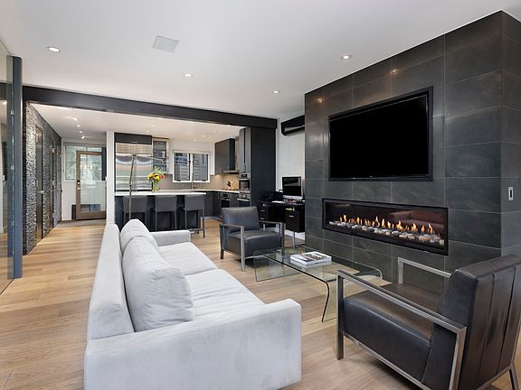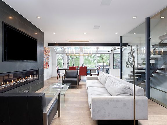 A total 1-year remodel project, designed by Libman Design Group, was completed in 2014 including vaulted ceilings, a raised main level, and redesigned hidden duct work to create a clean, light-filled, contemporary West End Aspen townhome. A single-stringer metal floating staircase wrapped in glass, and a basalt ledgestone wall are an impressive design statement. Wide plank white oak flooring is throughout. The main level powder room features an end cut wood accent wall from Oregon. A linear gas fireplace warms the living room. The open kitchen with island bar includes solid slab quartzite counter tops, stainless Bosch and Miele appliances, and pantry. The generous west facing master suite boasts a large walk in closet and a secondary closet. A jetted Whirlpool tub, Water Works fixtures, an