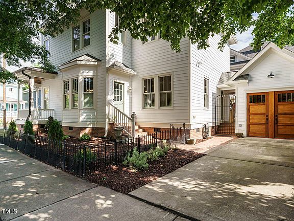 Bright, sunny, happy, comfortable - all describe this wonderful home within a couple of blocks of downtown. Walk to Longleaf Swine, Marbles Kid's Museum, Cafe Luna, and Fayetteville Street for regular events like Artsplosure, New Year's Eve First Night, and the IBMA World of Bluegrass Festival. Built in 2005, this home has all the hallmarks of an Historic Property: high ceilings, spacious rooms, a wrap-around front porch with Victorian detailing. Additional improvements in 2023 include a renovated laundry room, freshened up interior paint, new hardwood flooring upstairs, and the detached garage converted into a hip home office and workshop space. Terrific property in move-in condition. Community information located at https://www.historicoakwood.org/. Come see us -- you'll be glad you did!!