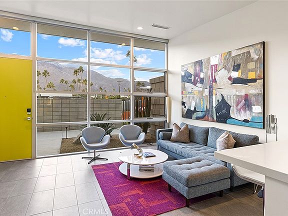 Newly built in 2015 and inspired by midcentury architecture, the Sophia community is an intimate enclave of just 9 residences built around a pool and surrounded by classic Palm Springs landscape. This single-level one bed, one bath home captures an abundance of natural light and floor to ceiling windows that provide unobstructed views of the San Jacinto mountains. The great room combines high ceilings and an open floor plan, blending seamlessly into the dining and kitchen space. A well-appointed kitchen offers bar seating, walnut grain cabinets, quartz counters, modern backslash, stainless steel appliances, and a washer/dryer closet. The primary bedroom features high ceilings, a separate entrance / patio access, and an ensuite bathroom. Meticulously cared for, community amenities include a resort style pool & spa, fire-pit, and a covered BBQ. This property provides ample opportunity as a primary, vacation or short-term investment with great rental history and a stellar online reputation. Located one mile from downtown with amazing restaurants, cafes, and shopping nearby, this home provides the fun lifestyle Palm Springs has to offer.