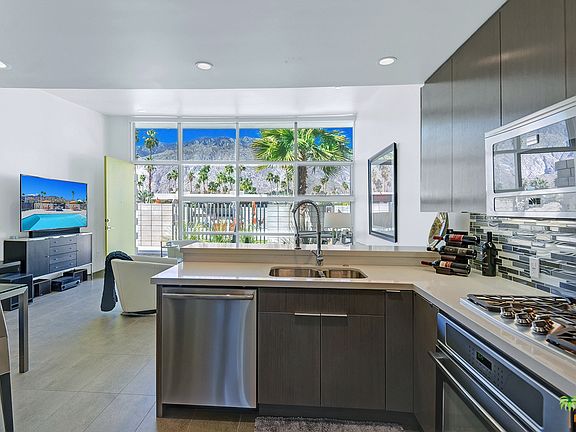 Newer, one level, Mid-Century inspired pied-a-terre for the young Hollywood Chic! Architecturally reminiscent of the "rebellious" 60's, and "swinging" 70's era, but with today's energy efficient construction features. This Sophia one bedroom condo is situated around a central pool, spa, fire pit, and covered bbq area. Unparalleled panoramic mountain views frame this piece of historically fashioned nostalgia. Entertain in style with private back patio and an amazing community area. Great room featuring large storefront style walls of glass, beautiful 12x24 tile, vaulted ceilings, and custom finishes are just a few of the finer touches. Kitchen equipped with an eat in bar, quartz counters, custom vertical grain walnut cabinets, glass tile backsplash, and upgraded with Frigidaire Pro Series 5 burner cooktop, refrigerator, oven, dishwasher and washer and dryer. This complex allows short term vacation rentals which makes this condo a great investment.