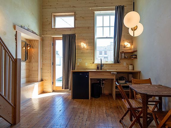 The Jennings Hotel is a design focused, self check-in, 14 room boutique hotel with 3000sq/ft of prime, street front restaurant and retail space. Extensive renovations of the hotel and commercial spaces have been completed since 2015. In the hotel, each guest room and common area has been thoughtfully modernized with individual plans from a curated roster of 14 designers. Custom fixtures & finishes, hand painted signage and site specific installations make every space in The Jennings Hotel a memorable experience. A Danish wood stove, spot-on record collection and wall-to-wall library in the well appointed kitchen create a welcoming atmosphere for enjoying a home cooked meal. Our balcony offers breathtaking views of the Wallowa mountains and the Finnish sauna is an outstanding amenity any time of the year. Extensive positive press has been written about The Jennings Hotel since its revitalization began in 2015, producing widespread brand recognition among design enthusiasts, boutique hotel lovers and those seeking extraordinary accommodations.
