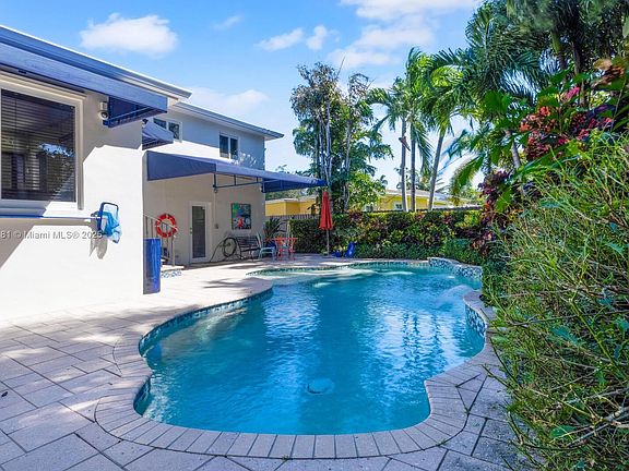 First time on the market in 57 years. House has 3/2, 1 bedroom on the first level w/a 4th potential bedroom or living area making it ideal for growing families or those needing extra space. Spacious indoor laundry room w/built in cabinets. Situated on a corner lot, the home features expertly maintained tropical landscaping that enhances curb appeal. The outdoor area is highlighted by an exquisite salt water pool and large patio, perfect for relaxation, entertaining,and enoying the outdoors year round. Inside,the kitchen has been updated w/modern amenities including large quartz counters,stainless steel appliances,Viking gas stove. Hurricane impact windows and doors. Updated plumbing and electric, a/c 2016. LR area along w/dining area and a Florida room all on 1st level.