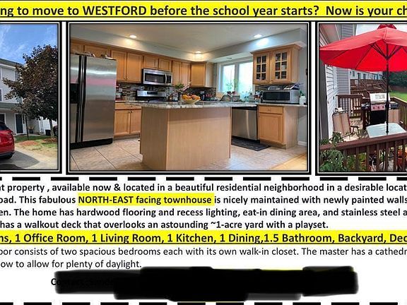 Fully upgraded 2 bedroom, 1.5 bath, and 1 office room condo with attached garage at very impeccable location & highest rated school district (Westford). Great neighborhood, desirable location for school going childran. North East facing with all hardwood flooring. recently painted with light and bright rooms and living area. Recess lights in kitchen and living area, Extra wide granite island to accommodate 4 people. Kids play area right next to the deck. First floor walkout deck that overlooks an outstanding ~1 acre yard with playset (swings and slides) Energy efficient sealed and verified by national grid. Snow removal and landscaping is taken care by association. Power plug outside the garage to change electric vehicle. Washer and driers are new and energy efficient. Semi furnished etic for storage. Schools: Elementary :Rita E Miller 2.5 miles Day Elementary 1.9 Miles Middle : Stoney Brook School 0.3 mile High: Westford Academy : 2.3 Miles. Dunkin Coffee and convenient Store, Gas Station are across the road (50 meter). Note: Rent is negotiable. Water is covered in HOA will be paid by Owner. Utility (gas & electricity, Internet) will be paid by tenant. Ranter insurance for interior will be taken by tenant. Free 2 parking with condo + plenty of guest parking around the building. Tenant needs to stick to association policy (Very Generic).