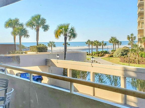 Very convenient 1st floor location with views of the ocean, beach, the Creek, Beach Club and pond. The balcony offers a southern exposure so you can enjoy wonderful afternoon sun in the winter and enjoy the beach sights while listening to the fountain, watching the ducks and the turtles. Ocean Creek has 57-acres of park-like grounds. 24-hour gated security, tennis center, pickleball court, putting green, multiple outdoor pools, and an indoor pool with whirlpool. The community has a wonderful oceanfront beach club with a snack bar and grill open in season, sand volleyball court, outdoor pool, playground, lockers, and restrooms. Building insurance is assessed annually. Property is currently a vacation rental. All figs. & sq. ft. approximate.