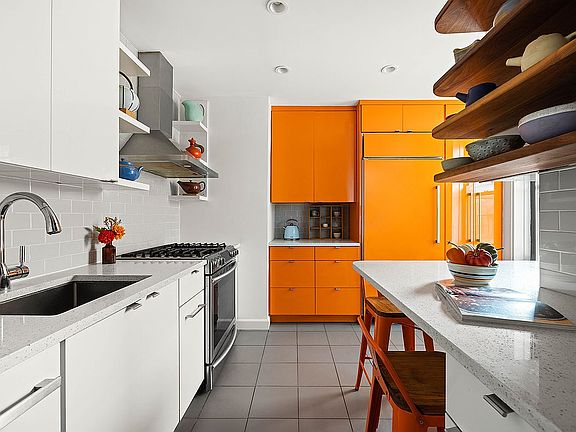 The galley, eat-in chef's dream kitchen is a true showstopper. Renovated with meticulous detail, it boasts thermoform cabinetry, quartz countertops, and high-end appliances, including a built-in Sub Zero fridge and a Bosch dishwasher. The windowed kitchen's vibrant design is perfect for cooking and entertaining, offering a delightful splash of color and light.