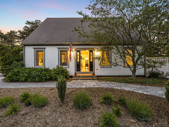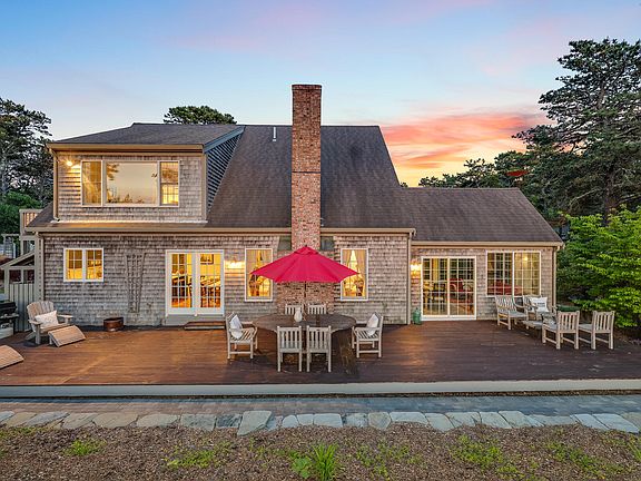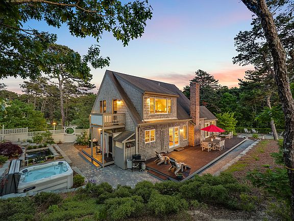 Nestled in a tranquil seaside haven, this home offers privacy, serenity, and convenience. Lovingly maintained by its original owner, it has never been rented. Minutes away is Wellfleet's bustling downtown with shops, restaurants, and bay beaches. A custom chef's kitchen with a spacious island, elegant marble countertops, and top-of-the-line appliances: Verona cooktop & range, Liebherr refrigerator, & Bosch dishwasher. Enjoy a cozy living room with a fireplace and a 3-season sunroom with cathedral ceilings. The spacious dining area is perfect for gatherings. The home also features a convenient first-floor bedroom and a second-floor open family/TV room with a balcony. The outdoor living spaces are exceptional, featuring a custom-tumbled bluestone waterfall, mahogany decking, stone walls, and a hammock for lazy afternoons. Extras include an outdoor shower, hot tub, raised garden beds, a gardening shed, privacy fencing, and multiple sitting areas perfect for watching evening sunsets.