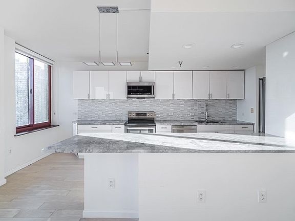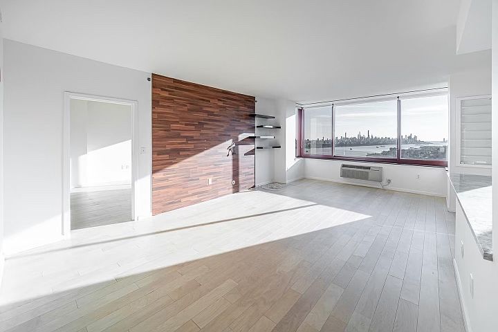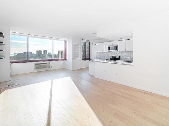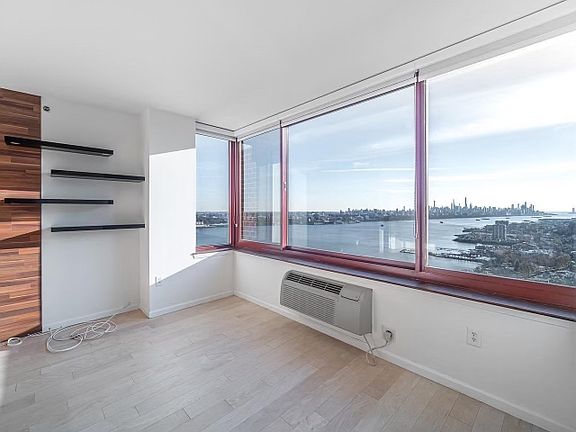 Luxury high rise unit with expansive views of New York City skyline. Beautifully renovated with open kitchen, an extremely rare feature in the building. Not a single detail spared: every bathroom, appliance, and floors in all rooms upgraded. Unit is absolutely beautiful, a must see! Building features on site management with full amenities which includes a outdoor pool, gym, children's playroom, community room, library, barbecue area, and area to walk dogs outside. Conveniently located with multiple points of access to NYC. The immediate surrounding area is filled with restaurants, supermarket, cafes, drugstores, and the new Hudson Lights shopping complex. Minutes away from NYC. Public transportation minutes away. 1 year lease. Tenant responsible for broker's fee, security deposit, and 1st month rent at lease signing. At least 700 credit score and 3x rent income. Tenant responsible for electricity. No Pets allowed. 2 garage parking included. No smoking on premises.