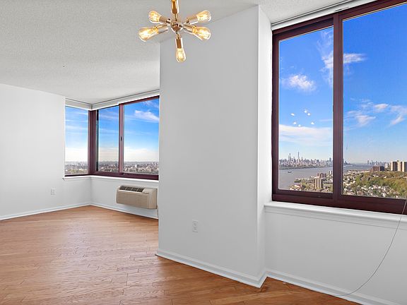 High in the Sky! Dream Views of Manhattan Skyline from every room! Conveniently located next to George Washington Bridge, illuminated with Southern Sunlight all day log! Spacious 986 sf, Airy, Lofty High Ceilings overlooking the entire stretch of the iconic city of Manhattan from the 40th fl of a 46 story hi rise! Freshly painted, new stove/microwave, dishwasher, laundry, LED lighting throughout. Primary bath w/ new vanity LED mirror plus new white quartz counter. Powder room w/ new vanity. New toilets. Easy commute via GWB, walk to everything - restaurants, shops, supermarkets, parks, schools, NYC transportation. Includes 2 in building garage spaces! Full amenities featuring 24 hr concierge, outdoor pool, gym, playroom, event room, dry cleaner on site. Walk in Closet, Formal Dining area. No pets, No smoking permitted.