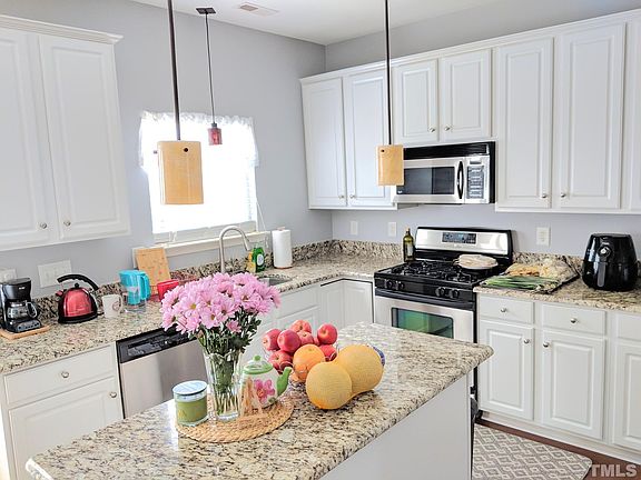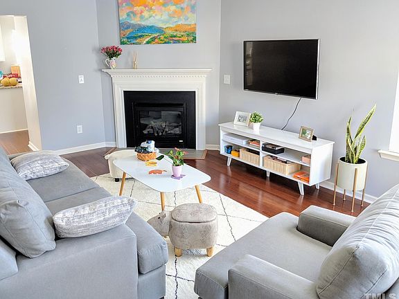 Enhance your living experience with this stunning, meticulously maintained 3-bedroom end unit. Beautiful bamboo floors grace both the main and upper levels, adding elegance and warmth throughout. The expansive living room, bathed in natural light from dual-sided windows, is perfect for relaxation and features a cozy corner gas log fireplace. The kitchen/dining area is a chef's delight, offering ample space and functionality with its granite countertops, 42-inch cabinets, and stainless steel appliances. A walk-in pantry provides extra storage, and easy access to the patio makes outdoor dining and entertaining a breeze. Retreat to the primary bedroom, where a vaulted ceiling and a spacious walk-in closet add a touch of luxury. The en-suite bathroom offers a serene escape with its whirlpool tub, separate shower, and stylish dual vanity. Located just across the street, you'll find a charming neighborhood playground and picnic area with a tranquil waterfront view, ideal for family outings or leisurely strolls. This prime location is conveniently close to Beaver Creek Commons shopping center, Wake Med, and provides easy access to Hwy 64 and I-540 for effortless commuting. Experience the perfect blend of comfort and convenience in this exquisite home. Rental Requirements - credit score 650+ min. - Household income 3x rents min. - no smoker interior - pet negotiable - Tenant is required renters insurance - Tenant pays utility