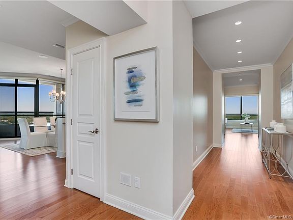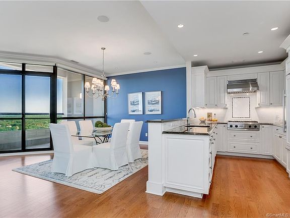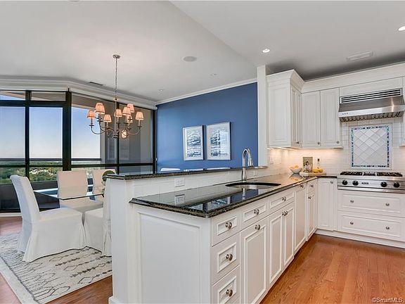 Don't miss this rare opportunity to own a highly sought after end-unit with unobstructed views on the highest residential floor in the building. Completely refreshed and newly staged, this home and the maintenance free lifestyle it offers will certainly appeal to the most discerning buyer.The versatile floor plan features a gourmet eat-in-Kitchen w/top of the line stainless steel appliances, custom cabinetry, granite countertops and breakfast bar open to Dining area and balcony w/views of LI Sound and beyond; Master Bedroom Suite w/separate sitting room and walk-in closet, spa-like Bath with his and her vanities, frameless glass shower and separate soaking tub; Guest room w/walk-in closet, hall Bath and Laundry area. Building amenities include 24hr security and concierge service, Penthouse w/fitness center, rooftop lap pool, sauna, massage room, and so much more! Brand new shopping and restaurants continue to develop in the immediate area; access to commuting highways are just minutes away. Come see why so many residents are enjoying maintenance free living! **HOA Fees Incl: Gas for heat & cooking, water, 67 channel Direct TV, Internet, exterior & interior common area maintenance, 7 Day/24 hour Security and Concierge service, deeded storage unit, trash removal, common area taxes, exterior window cleaning, snow removal & landscaping, master property insurance, secure indoor garage parking, pool maintenance, access to and full use of the "On-Site Home Owner Amenities" **