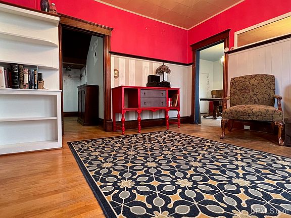 Ideally situated on a spacious corner lot, this three-bedroom historic home is just a short walk from Calumet Public Schools in the heart of Laurium. Revel in the character of this classic residence, which boasts an array of original features. As you enter through the inviting three-season porch, bathed in natural light, the timeless elegance of the hardwood floors and exquisite woodwork throughout welcomes you. To the right is large walk through living room and dining room. From there you travel into the the kitchen and a convenient three quarter-bath both currently undergoing renovations, adding a modern touch to the vintage charm. Original wooden doors throughout and a large pocket door between the living and dining rooms preserve the home’s historic integrity. Venture upstairs to find three generously sized bedrooms and another three quarter bath. Additionally, a versatile small room on the second floor offers the perfect space for a home office, a large closet, or whatever suits your needs. The property also includes a sizable attic for extra storage, a full unfinished basement, a detached garage that once served as a carriage house, and an additional shed for all your outdoor storage needs. The fenced yard provides a secure and private outdoor space for both children and pets to play. Featuring a newer natural gas furnace and classic radiators, this home combines the comfort of modern amenities with the charm of yesteryear. Offered 'as is,' and priced to sell this property is a rare gem waiting for someone to rekindle its historical splendor. Don’t miss your chance to own a piece of Laurium’s history. Schedule your visit today!