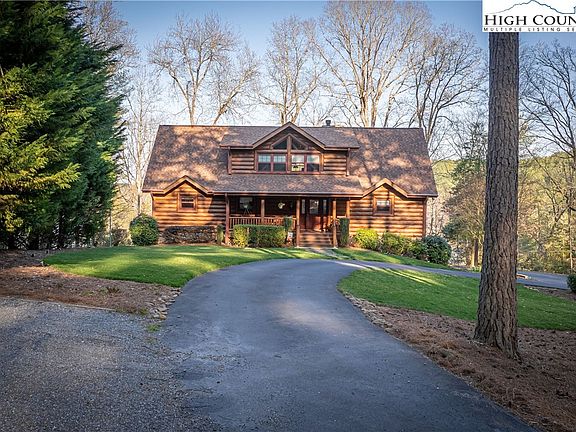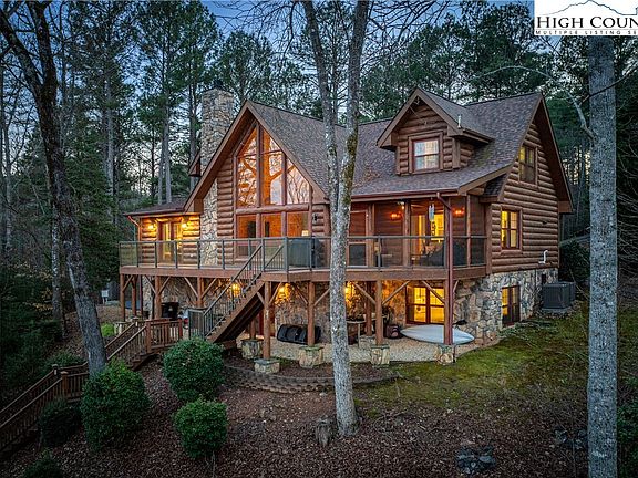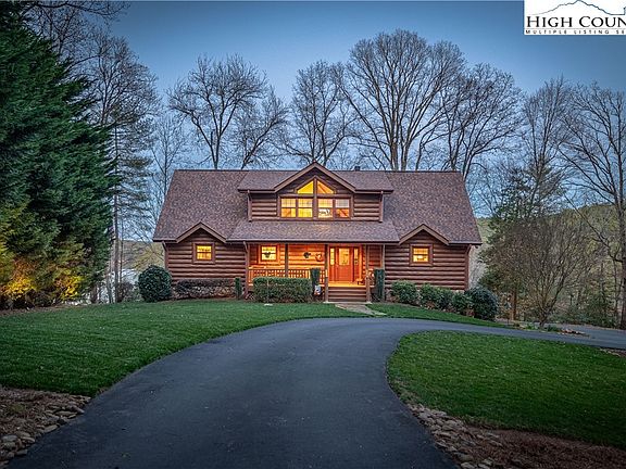 Experience tranquil and peaceful living in this rustic log cabin on Lake Rhodhiss. If you enjoy boating, fishing, or lake living, this home is ideal, as it is set on a private lot with a floating dock just off the main channel. This four-bedroom cabin features a Trex back deck, a screened-in porch, and a front porch. As you step inside, you'll feel the warmth emanating from the two-story stone gas fireplace, knotty pine walls, and a wall of glass windows overlooking the lake. The kitchen boasts a large island, breakfast bar, granite countertops, dining area, laundry room & walk-in pantry. The primary bedroom offers lake views, an en-suite bathroom with an enclosed tile, two vanities, and a walk-in closet. You'll find spacious bedrooms with built-ins, a hallway with flex space, and a full bathroom upstairs. The basement provides additional entertaining space with a family/bonus room, a bedroom with incredible views, a full bathroom, and a spacious two-car garage with storage.