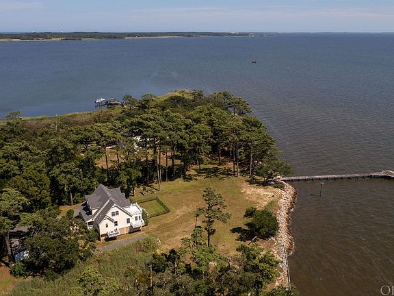 100 Raptor Point… A property of Epic Stature with no current equal in land size and water frontage on the Outer Banks of NC. As you meander through several hundred feet of gravel drive, you become encompassed in a Maritime Forest with canopies of wise Ancient Oaks, NC Pines, Bayberry, Holly and Dogwood Trees all tying into the flowing hill sides perfectly. This all brings us into a wide clearing with Natural Light that directs itself upon the doorstep of this Awesome Coastal home overlooking miles of water views. This is a statement piece and one we stand behind proudly as this Raptor Point Estate offers over 5.3 Acres of unique land all while encompassing the focal point of the Albemarle Sound and 329 Feet of true Water-Frontage. This Shoreline is all shored up with Bulkhead and Rip Rap and offers you an in depth view of the Albemarle Sound and an understanding of why this Jewel is a one of a kind property. It’s a scene to behold and places you in awe of the natural setting with only two properties on this private point this is as secluded as you will find anywhere along our coastal shores. This lot also includes an already Subdivided parcel giving you ample opportunity to create a Homestead or just keep your privacy intact. The 200 Feet of Pier offers deep water access,10,000 LB. Boat Lift and Kayak launch with a large deck on the end. These mesmerizing views offer Sunsets that will burn into your memory banks all while overlooking the Resident Osprey nest that is situated just off the shoreline. A Variety of other NC species including Eagles, Pelicans, Red & Blue Birds, Otters, Dolphins, Red Drum, Speckled Trout and Deer frequent the Raptor Point site often. Stepping up the Covered decks and through the 3 Tier Black Craftsman doors with Seed Glass you will find a grand entry with 20 Foot plus ceilings exemplified by a gorgeous chandelier lighting the Solid Oak Floors that carry through the home. Instant water views through the Wall of 17 Glass Picture windows creates a Natural lightshow that shows off the clean lines and immense beauty of this home. The main level Offers a dedicated dining room, Den space, Living Room with Fireplace and a breakfast nook. The remodeled Kitchen includes rare River washed granite counters with amber coloring, Quality SS appliances, Blue Note Commercial Gas range and Vented Hood with a fill spout as well as a walk-in pantry room that includes a Washer and Dryer, Half bath and separate entry/exit. Finishing off this level is the En-Suite and sitting room with water views and a lavishly remodeled bathroom to include an enormous walk in tiled shower as well as Dual Vanities. The open stairwell leads you to the second floor complete with 3 bedrooms, a loft and a full hall bath. The views continue on this level and a private porch compliments the upstairs En-Suite all overlooking this wonder of the Outer Banks……Raptor Point. Many recent updates include lighting fixtures, new roof, new 4 bed drain field, addition of rip rap, some windows and new Interior Paint this is a home to boast about. Zoned BR-2 with a variety of uses and suitable for Bed & Breakfast and business applications this is the best opportunity in years for waterfront acreage and seclusion. Raptor Point is a legacy property…..we invite you to come and make your own mark.