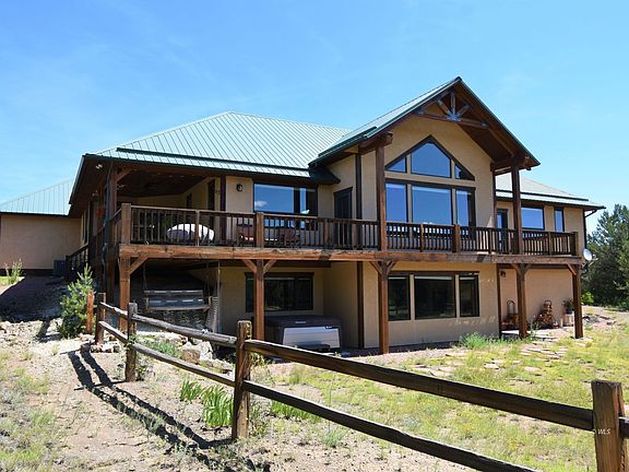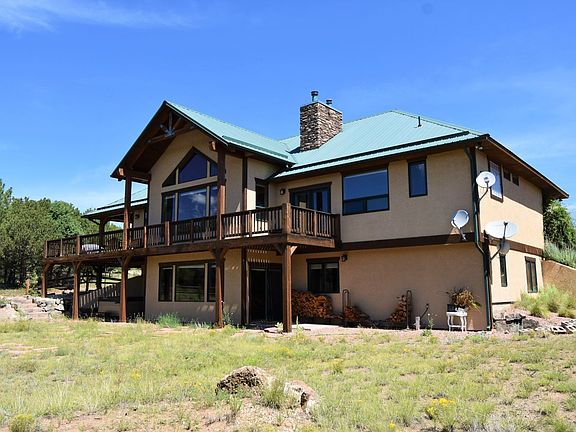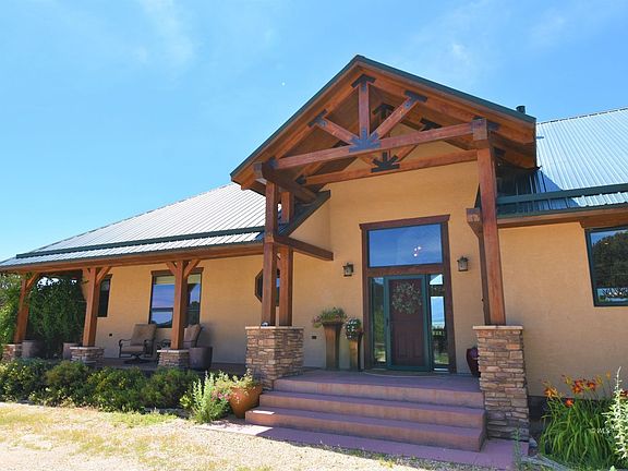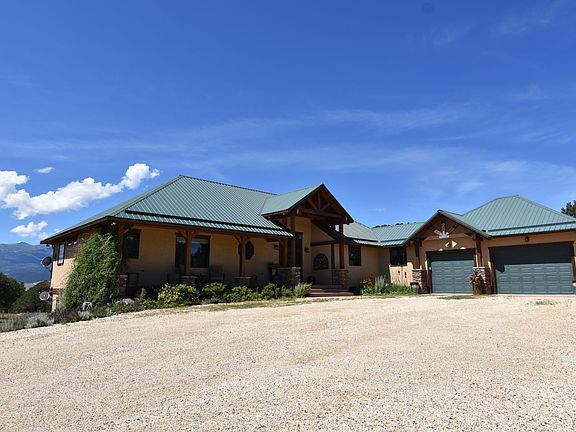 This spectacular mountain home is a guaranteed show-stopper! Nestled on 35.78 acres of picturesque land with stunning Sangre De Cristo Mountain views! This beautiful home is well built and well maintained and offers a range of impressive features throughout. An open floor plan features a grand entry, beautiful Hickory hardwood floors, and a spacious living room with soaring vaulted ceilings and massive 2 story windows to bring in the mountain views. You will love to host friends on the wrap-around deck while enjoying the views, or inside in front of the stacked stone fireplace. An open kitchen with Alder cabinets, a large island and modern appliances flows into to the dining room and breakfast area. A main floor primary bedroom offers an ensuite bathroom, large walk-in closet and direct access to the deck along with sensational views! The lower level includes a huge family room with wood burning stove and wet bar, plus two bedrooms with walk-in closets, a full bathroom, and plentiful storage. Extra features include a backup generator, central air conditioning, detached 40x26 garage with workshop, a 42x12 barn with a tack room and three stalls, 2 full RV stations, security system.