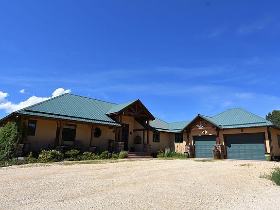 This spectacular mountain home is a guaranteed show-stopper! Nestled on 35.78 acres of picturesque land with stunning Sangre De Cristo Mountain views! This beautiful home is well built and well maintained and offers a range of impressive features throughout. An open floor plan features a grand entry, beautiful Hickory hardwood floors, and a spacious living room with soaring vaulted ceilings and massive 2 story windows to bring in the mountain views. You will love to host friends on the wrap-around deck while enjoying the views, or inside in front of the stacked stone fireplace. An open kitchen with Alder cabinets, a large island and modern appliances flows into to the dining room and breakfast area. A main floor primary bedroom offers an ensuite bathroom, large walk-in closet and direct access to the deck along with sensational views! The lower level includes a huge family room with wood burning stove and wet bar, plus two bedrooms with walk-in closets, a full bathroom, and plentiful storage. Extra features include a backup generator, central air conditioning, detached 40x26 garage with workshop, a 42x12 barn with a tack room and three stalls, 2 full RV stations, security system.