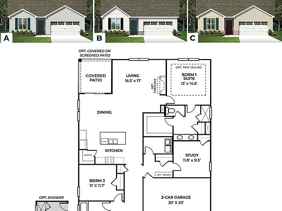 This very popular Sophie plan is a true ranch with amazing flow. This 3 bedroom home also has a flex/study tucked away for a quiet office or craft room. Go from morning coffee on the screened deck to breakfast in the open informal dining space. Many amenities including beaches, swimming pool, tennis, shuffleboard, clubhouse, putt putt golf, & more. Also, offering 2"faux wood blinds AND our smart home features to help make your life easier! Pictures are representational and not of actual home.