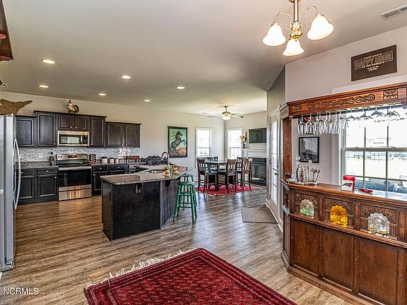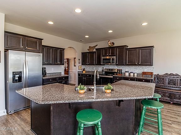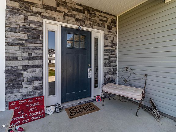 Stunning 4 bedroom 2 1/2 bathroom home in the popular neighborhood of Fieldstone Village! Walk into the foyer with large formal dining room off to the left. The living room is open to the HUGE kitchen. Laminate flooring throughout all of the first floor living spaces. First floor also offers a 1/2 bath! Living room features an electric fireplace and a 2nd fireplace is located in the additional dining area/flex space off the kitchen. Kitchen features TONS of cabinets and granite countertop space, tile backsplash, stainless appliances, island with ample seating and a pantry! All bedrooms are upstairs. Large primary bedroom with en suite that wraps through to the walk in closet and also accesses the laundry from master closet as well! Dual vanity in primary bath, soaker tub and walk in shower. HUGE corner lot with fenced backyard. Custom shelving in garage to convey. Covered patio is perfect for entertaining! Close to shopping, base and all that Goldsboro has to offer!