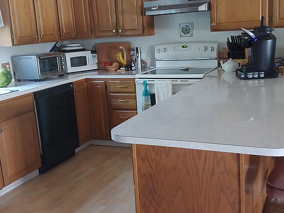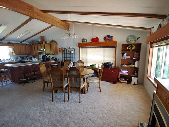 MANUFACTURED HOME IN 55+ PARK. Newer roof and double pane vinyl windows throughout. Zillow "last sold date" and "acres" and est. value are all wrong! This house last sold in March 2010. It sold for $78,900. There are no acres, it is a manufactured home community. The rental lot is 50x80++. The comps for this house are over $100,000. It also has upgraded Oak kitchen cabinets. All appliances stay. 2 pantries. Walk in closet in Master. Partially furnished: dining room table w/6 chairs, bfast bar stools, entertainment center, upright desk, electric fireplace, deck lounge chairs. The oversize 2 car garage has built-in cupboards w/doors, deep sink, work bench, potters bench, pull down steps for rafters access. The home is supported by helical piers and steel beams for secure waterfront living. Enclosed entryway, River-side upper deck as well as approx. 650 sf lower deck for fishing, swimming, kayaking, entertaining and catching the sun. Lots of off-street parking