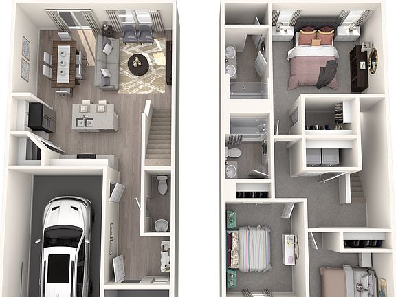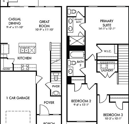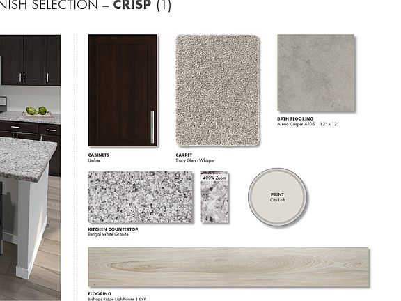 Prep dinner at the kitchen island while mingling with guests in the open-concept great room. White cabinets with granite countertops, Oak EVP Plank flooring and carpet in our Cool (2) Package.