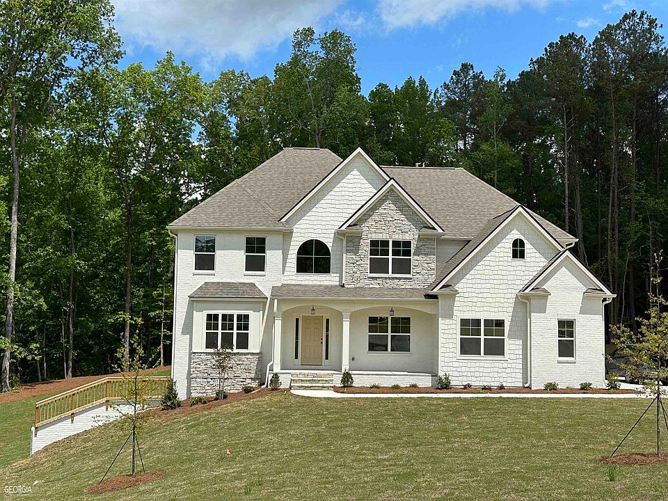 Millwood C - 5 BR & 5 BA on Partially Finished Basement - Cul-de-sac Lot - Two story family room with wall of windows. Stone Fireplace. Covered Back Deck with Poured Patio Below. Open Kitchen with wall oven, gas stove, walk-in pantry, center island with granite counter. Guest Bedroom, Full Bath, Living Room and Dining Room also on Main Floor. Primary Bedroom with sitting area. Owner's bathroom with dual sinks, garden tub, tile floors, walk-in tile shower, separate toilet closet. Three additional bedrooms and two full baths also on 2nd floor. Partially finished basement includes media room and full bath. Unfinished areas for storage. Lots of windows, glass doors and patio open into private wooded back yard.