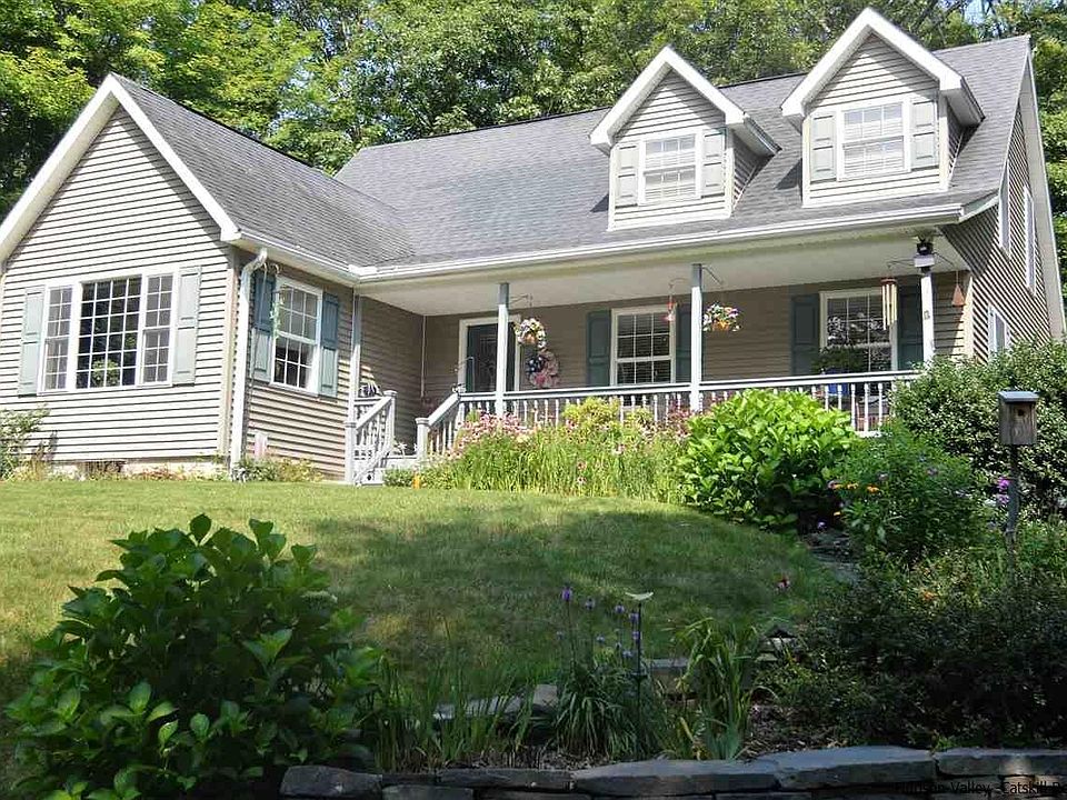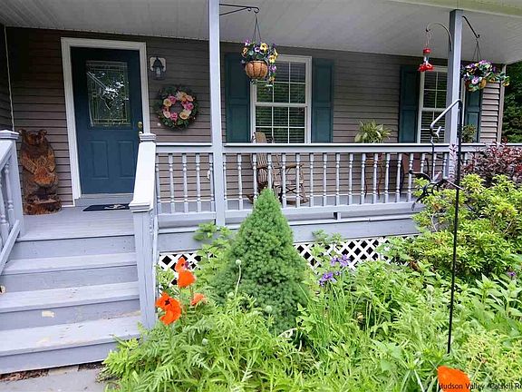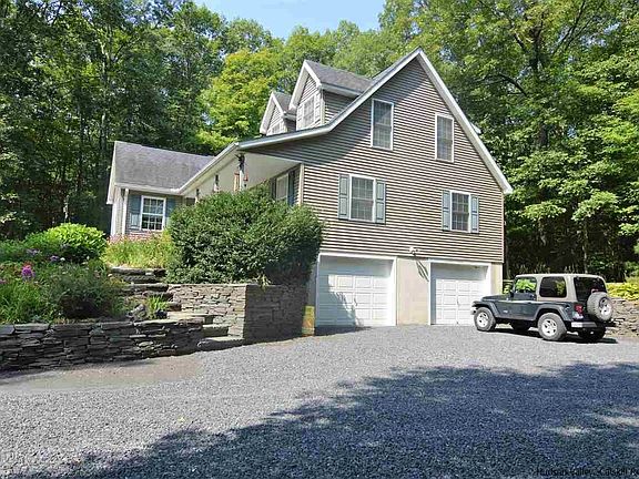 The perfect country home on five private, wooded acres. Beautiful landscaping with a colorful variety of perennials combined with lavish stone work. It features a bright, open kitchen/dining area with plenty of counter space and new 2018 stainless steel appliances. Two bedrooms on the first floor where one opens to a deck with 2015 hot tub. Sports the ease of a first floor washer and dryer. Second floor bedroom currently in use as an office plus a large master suite with walk-in closet. Great mechanical systems with a 2015 boiler, 200 amp service and gasoline fired generator in place. Enjoy the ambiance of the property on the sweet covered porch. Take in the abundant wildlife and song of the birds. Bird houses hosting a third family of bluebirds! Plus bonus feature that the property adjoins 21.5 acres of NYS land. Ideal location with minutes to shopping and restaurants, NYS Thruway and close proximity to Woodstock and the Catskill Mountains.