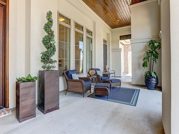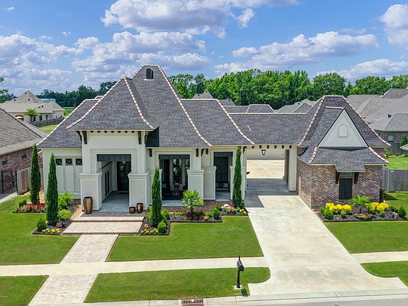 100 Rue De Langon is Luxury at its finest and everything you've been waiting for! Drive up thru the Estates Porte Cochere into a courtyard that boasts a 2 car garage as well as a separate 1 car garage that could be utilized as an additional storage space or a recreational room and features its own separate entrance. As you make your way to the front of the property, you'll notice beautiful landscaping complete with an automatic misting system and a welcoming gas lantern suspended above the glass paned French doors. Step inside to find a grand foyer that opens to the dining room, living room and kitchen areas that is highlighted by 14ft ceilings that elevate to 15ft. The formal dining room is adorned with an up lighted double tray ceiling, custom chandelier and picture windows which seamlessly flow to a Butler's pantry and separate oversized walk in pantry. The Living area presents an open concept that is perfect for entertaining and includes a coffered ceiling, gorgeous views of the pond, a gas fireplace and a brick archway that transitions into the kitchen. Showcasing designer colors as well as backsplash accents, the kitchen is a chef's dream with a large island and farmhouse sink, custom painted maple cabinets and is equipped with all top of the line Thermador stainless steel appliances. The Estates split floorplan gives guest a separate wing of the home away from the Master bedroom. Down the guest wing you will find a half bath with easy access to the patio, a built-in office desk area, a large utility room, 3 bedrooms and 2 full bathrooms. The Master wing showcases 180 views of the pond, is accentuated by 4 antique cypress beams and opens to a spa like Master bathroom. Inside you'll find a Buttress ceiling with a crystal chandelier, double vanities, a whirlpool tub which is set in front of a walk-in shower with dual shower heads and an expansive master closet. The property also includes a 3-zone audio distribution system that can be heard from the master bedroom, living room and outside patio. The patio provides stunning views of the pond, a gas fireplace and lush landscaping complete with a full outdoor kitchen which includes a grill, mini fridge, cooktop and sink. The backyard has ample space for a pool and has fencing along the side perimeters of the yard for added privacy. Schedule your private viewing of this Luxury home in the highly coveted Monjardin subdivision.