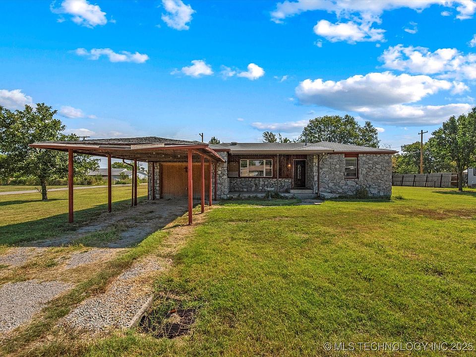 Spacious 3-bedroom, 2-bathroom home for sale in Ochelata, OK, set on a 0.3-acre (m/l) corner lot. This single-family home offers two living areas, including a cozy den with a fireplace. The first living room features wood flooring, adding warmth and charm. The rock exterior provides durability, while the attached two-car garage, detached three-car garage, and front carport offer plenty of parking and storage for vehicles, tools, or hobbies. Conveniently located near Bartlesville and Tulsa, this property is a fantastic opportunity for buyers looking for space and potential. This property is being sold as-is.