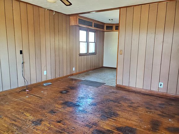 Corner lot property featuring a home with three bedrooms and one bathroom, including a sunroom and utility room. The layout offers a kitchen/dining area combination. Other features - Display shelves in all 3 bedrooms and a built-in ironing board. Additionally, there is a detached garage/workshop with a half bath. Property is selling as is. Buyer & Buyer's agent to do own due diligence on lot measurements & sq ft.